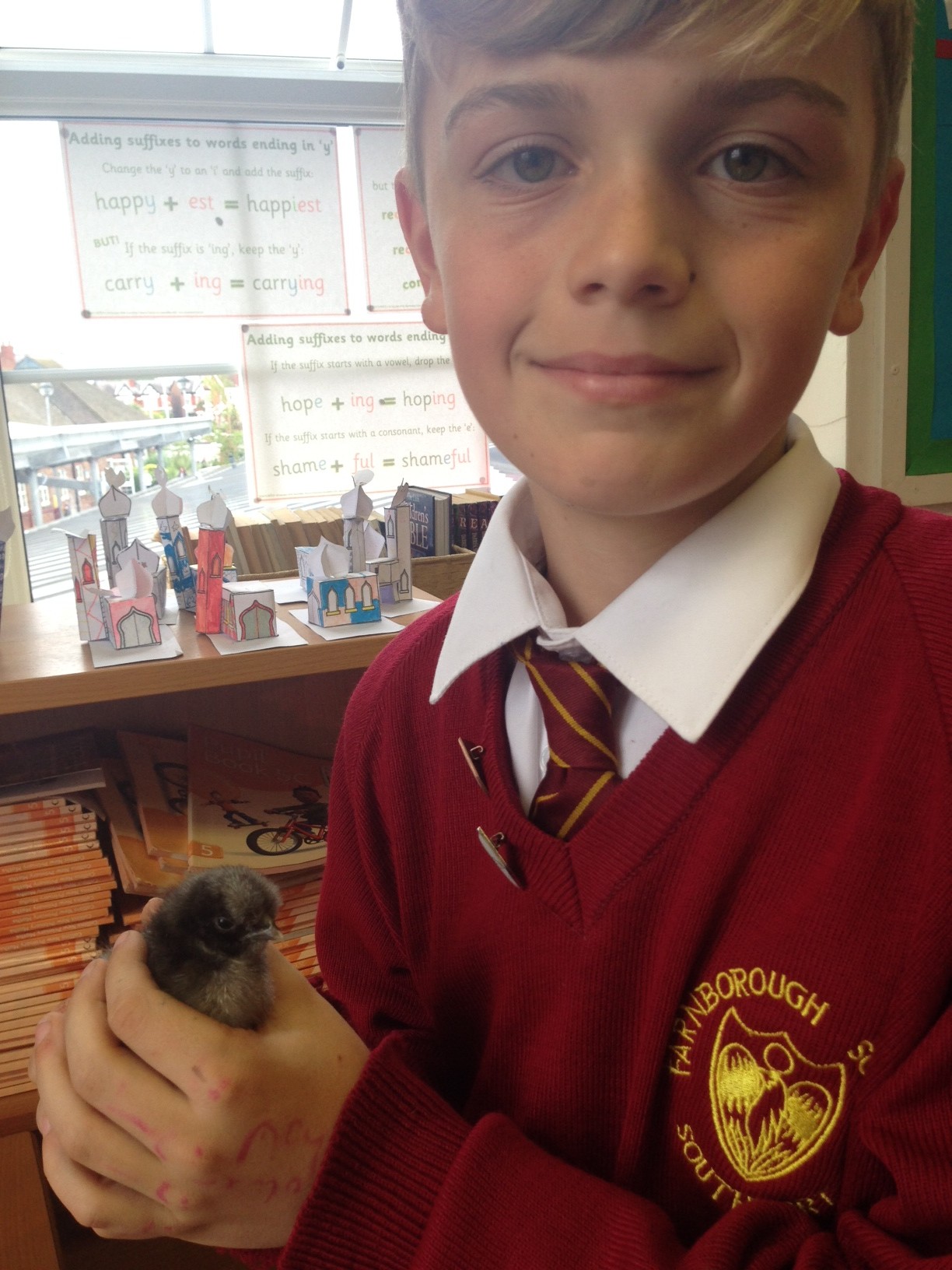 We have to change their newspaper twice a day and give them a bowl of chicken food a day but the chicks can have as much water, as they want. As well as that if the chicks are cold they go under a light, and then we fold both of the lids closed. If they are warm they go away from the light. Overall I think having the chicks have been a great experience and education -especially holding them! I would love to have them again and I hope next years pupils enjoy them as much as I did.